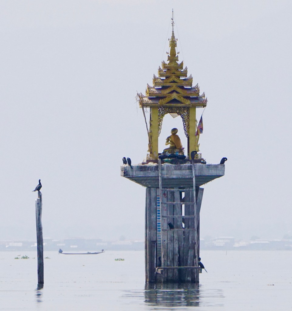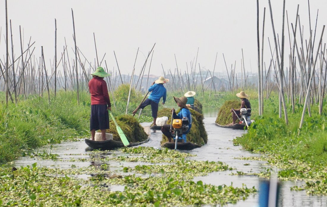 One side of the lake has extensive floating gardens tended by Intha families. From a distance it looks like tall pikes but these poles stake the “ground” and hold the composted seaweed and other fertile matter in place. The men dredge up the milfoil growing near the shoreline, load their boats and bring it back to their garden for tomatoes, peppers, beans and flowers. We watch them strain and struggle hauling this seaweed onto their boats. Shocking to see a much abhorred invasive at home being a necessity in another’s food chain.