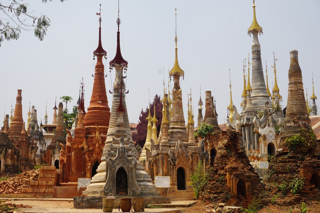 We have visited a lot of temples and pagodas which surprisingly remain fascinating. In Indein, there is a small temple at the end of a very long covered walkway that hosts a long line of stalls and tables filled with must have souvenirs: daggers, tooth headdresses, clothing, baskets and more friends of Soe’s. The walkway also divides the enormous amount of stupas built around the Temple; tourists generally exit left and view the new ones. We go right and into the ruins. The worship of Buddha is everywhere.