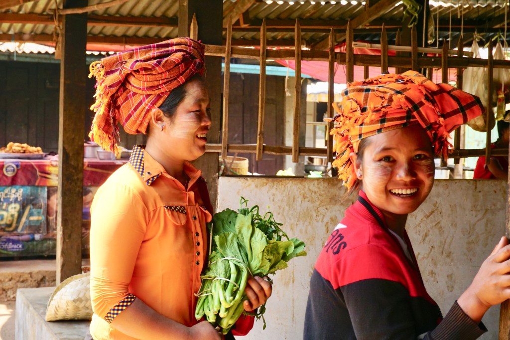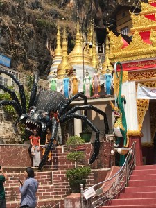 There are several villages strung along the lake. There are the usual markets where folks gather for produce or the big “5 day” market of Indein which has a dentist, a barber, and all kinds of goods and food and rotates one day in each of 5 villages. The parking area is huge though as the waters recede in dry season the boats must park further away to avoid running aground. There are many Pa-O and Intha people at the big market including a friend of Soe’s. The Pa-O women wrap their hair in scarfs or towels and when in Temple adorn the hair cloths with a pointy ornament to represent a dragon horn. They believe they are descendants from a female dragon centuries ago. As our guide is Pa-O she has a set of horns too. She leaves them at home when she is working.