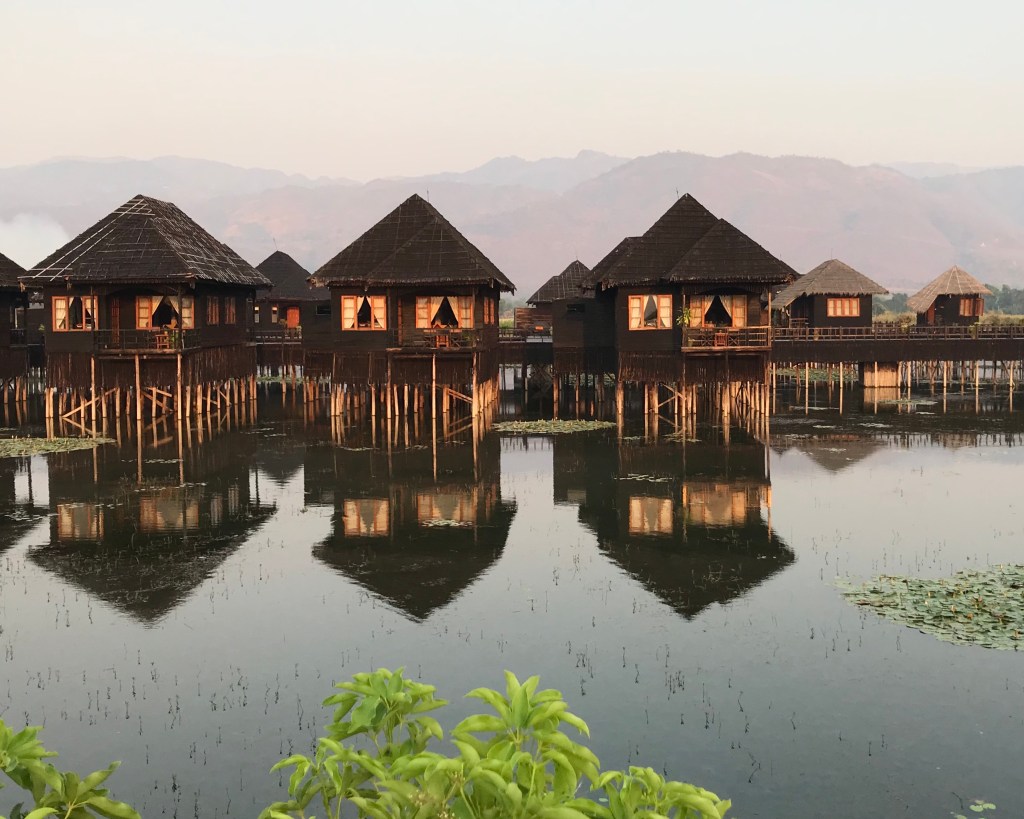 Inle Lake is very large and takes an hour to boat to our hotel. We have never stayed in such a place. We are dropped off at the entrance dock, shown our room and like little kids, explore every space, shrieking with excitement; an outdoor shower, a porch on the lagoon at sunset, a couch, a table, a desk and flowers all over the bed and lots of birds and nature.