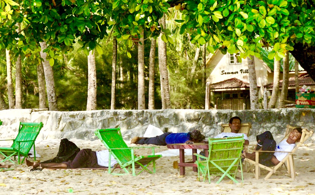 Nice beach. The Yoma Cherry is the only hotel in this cove and the geography provides safe harbor to fishing boats anchored at the shore. We top off our daiquiris, swim in the warm Andaman Sea, cream on the sunscreen, and mellow in the shade of our palm frond palapa.
