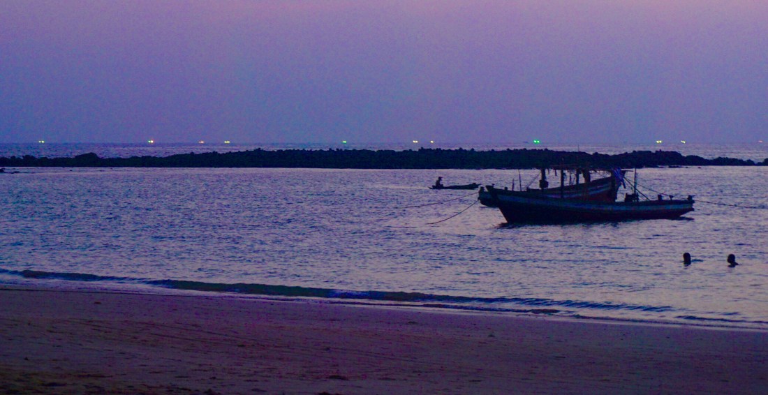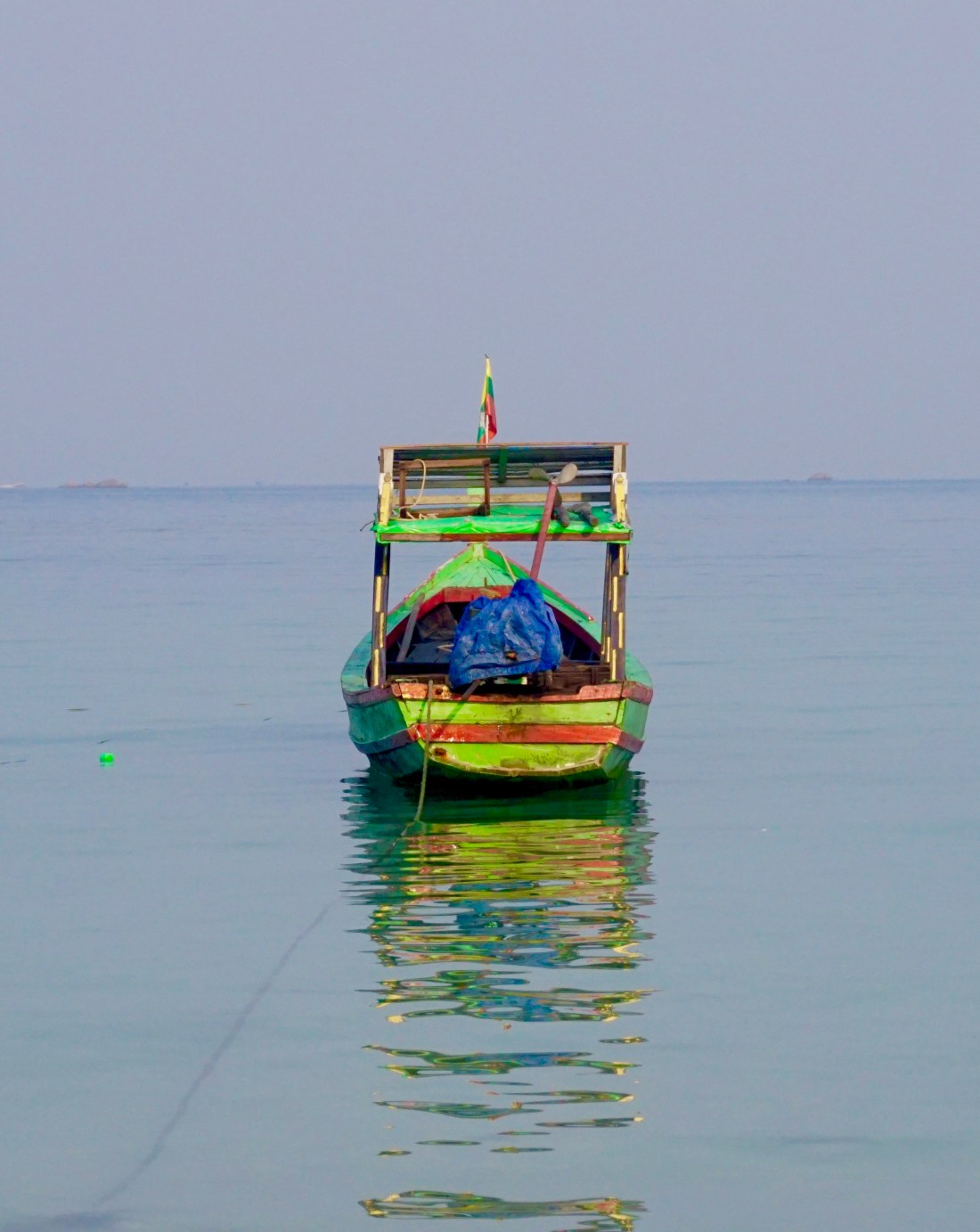 There is a lot of waiting, milling around and then somehow the timing is right and they roll up their longyis, wade out, climb up the sides like ants over the gunwales and take their places. Preparations are made, engines are engaged and one by one the boats launch out to sea for the night of fishing. The boats are strung with high intensity lights that draw the small silver fish into the nets, night after night. It looks like a little city spread out along the horizon. It is also a lovely time to swim.