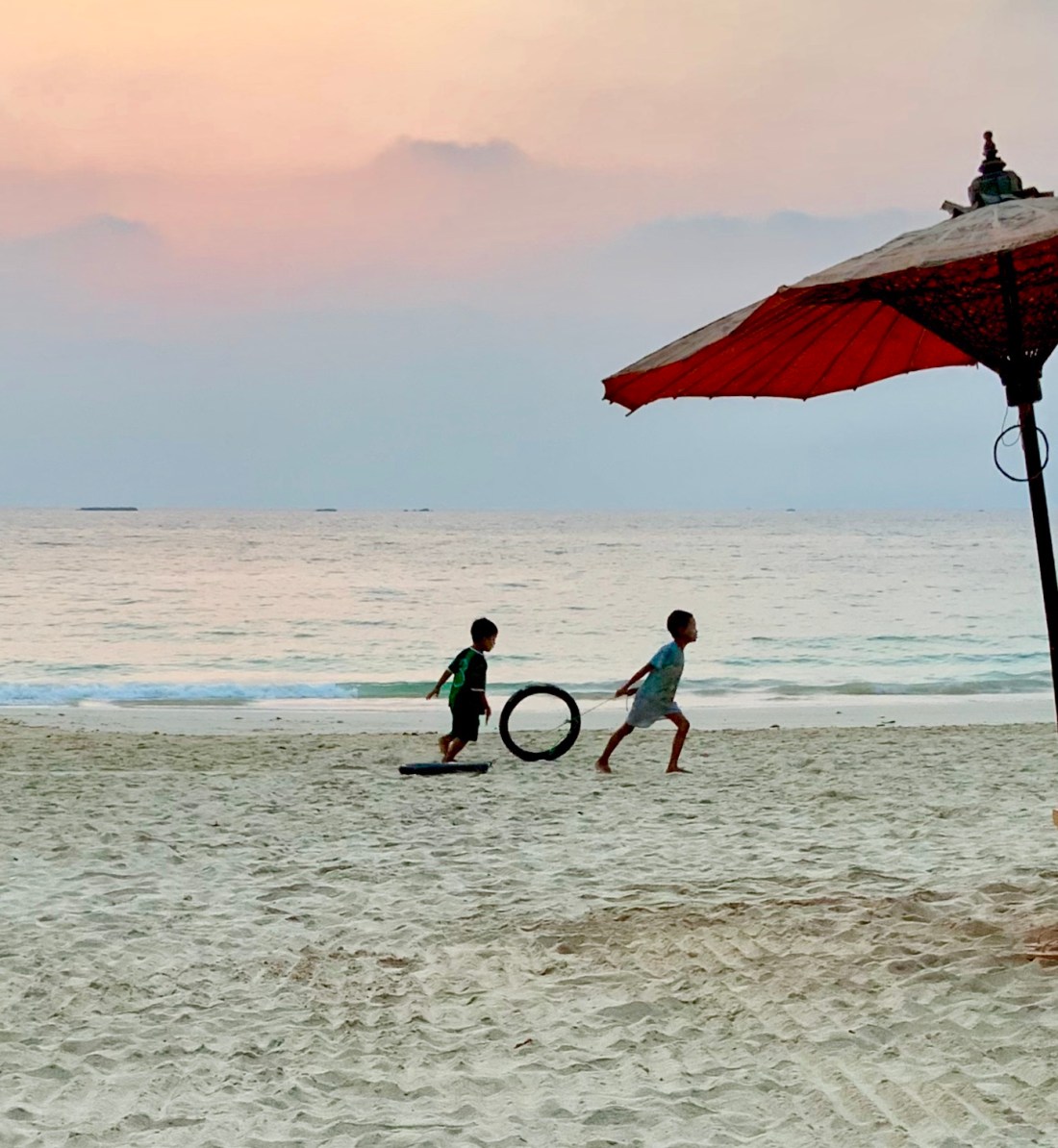 We leave our stuff and hit the beach so quickly the sweat flies off our skin.