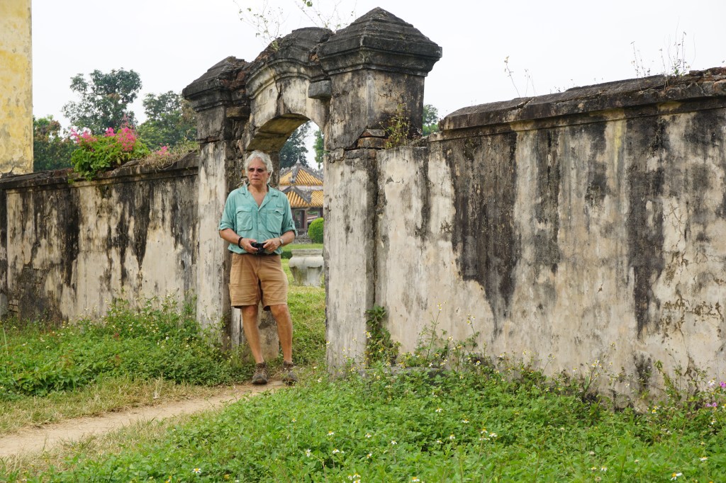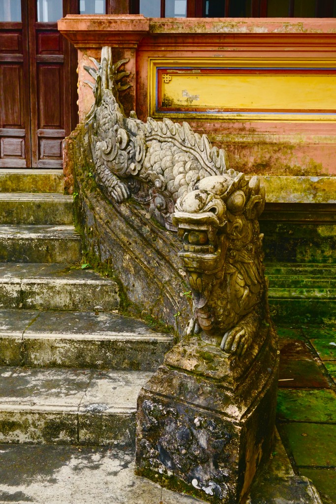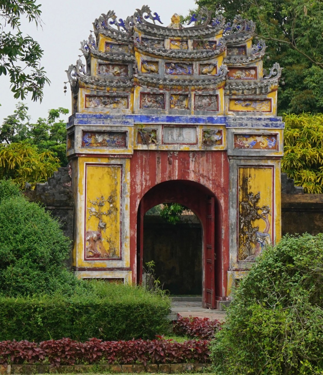 Hue, is a city located on the Song Huong or Perfume River. Years ago, the blossoms from the orchards upriver scented the river earning its name but we have been told that industrialization has usurped that bucolic time. It is however, the site that Emperor Gai Long of the Nguyen dynasty chose when he moved the capital from Hanoi in an effort to extend his influence over a unified north and south Vietnam in 1802. He built the Citadel, a walled city surrounded by a 4 sided defensive wall with each side a mile and 1/2 long surrounded by a moat. The Imperial City became the epicenter of culture, learning and worship in the country. The southern end of the city housed the Royal Palace, gated courtyards, pavilions, gardens, library, temples and “The Purple Forbidden City”: the emperor’s personal spaces, lodging for each of the four Queens , his 102 concubines, their 142 children and the eunuchs that served them.