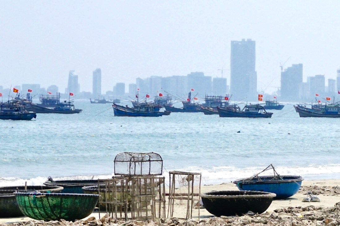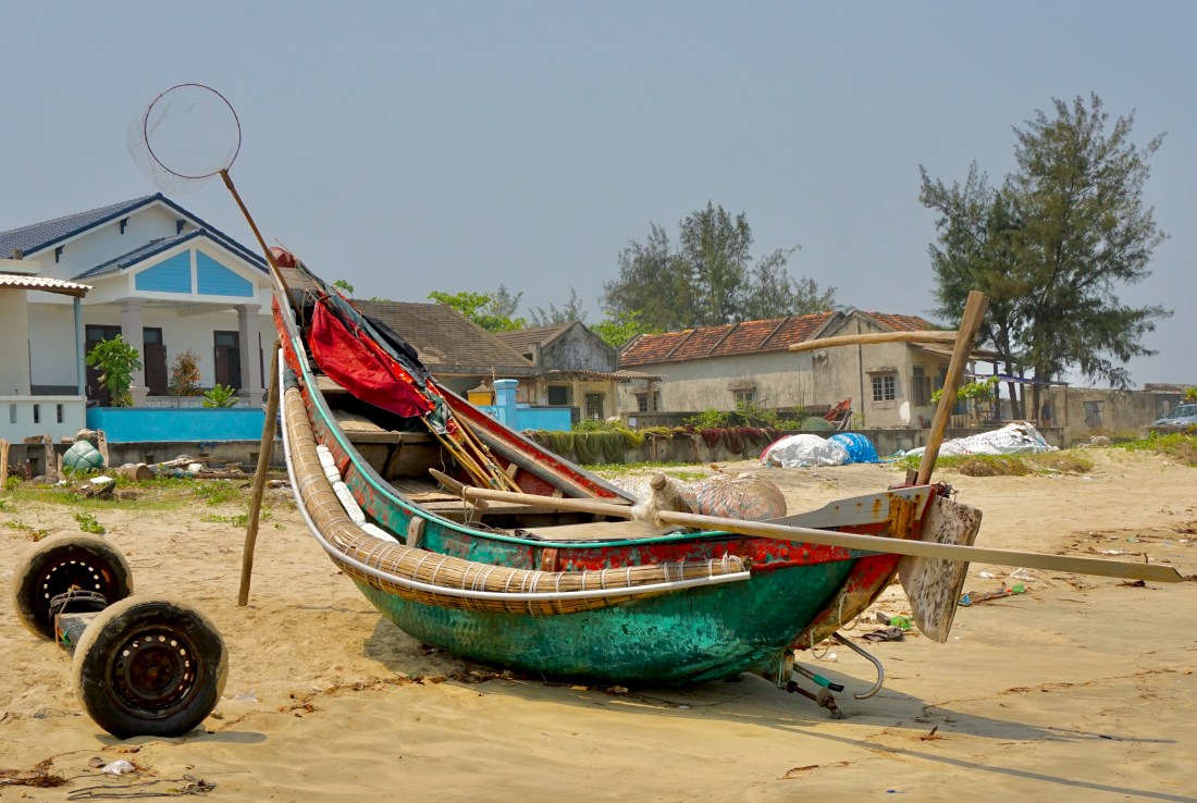 Our driver, Dong, takes us into his home village. Languid and deserted, boats are parked on the street with no one around. I walk onto the beach relishing the sand, checking the boats hiked up against a cement wall or marooned in brush. All are rigged with wrapped reed side pieces called sponsons that extend the hull and help with flotation and stability. I am loving the different kind of boats that are used in Southeast Asia and wondering if these belong to early morning or night fishing folk.