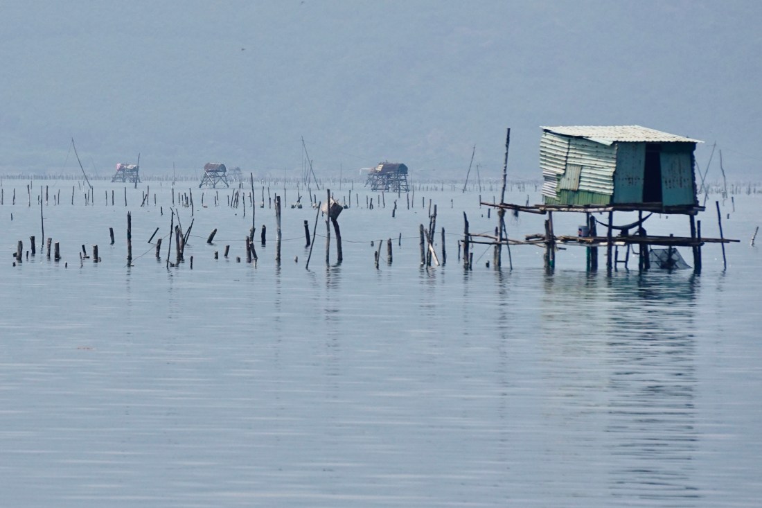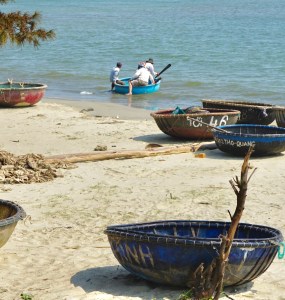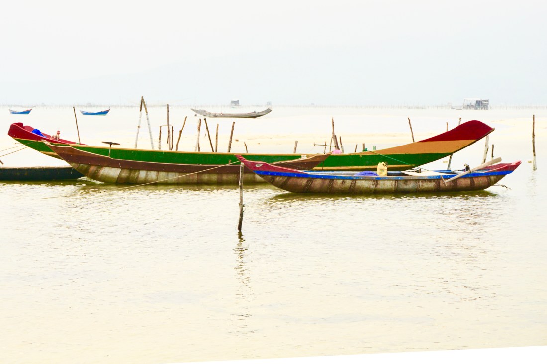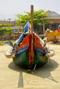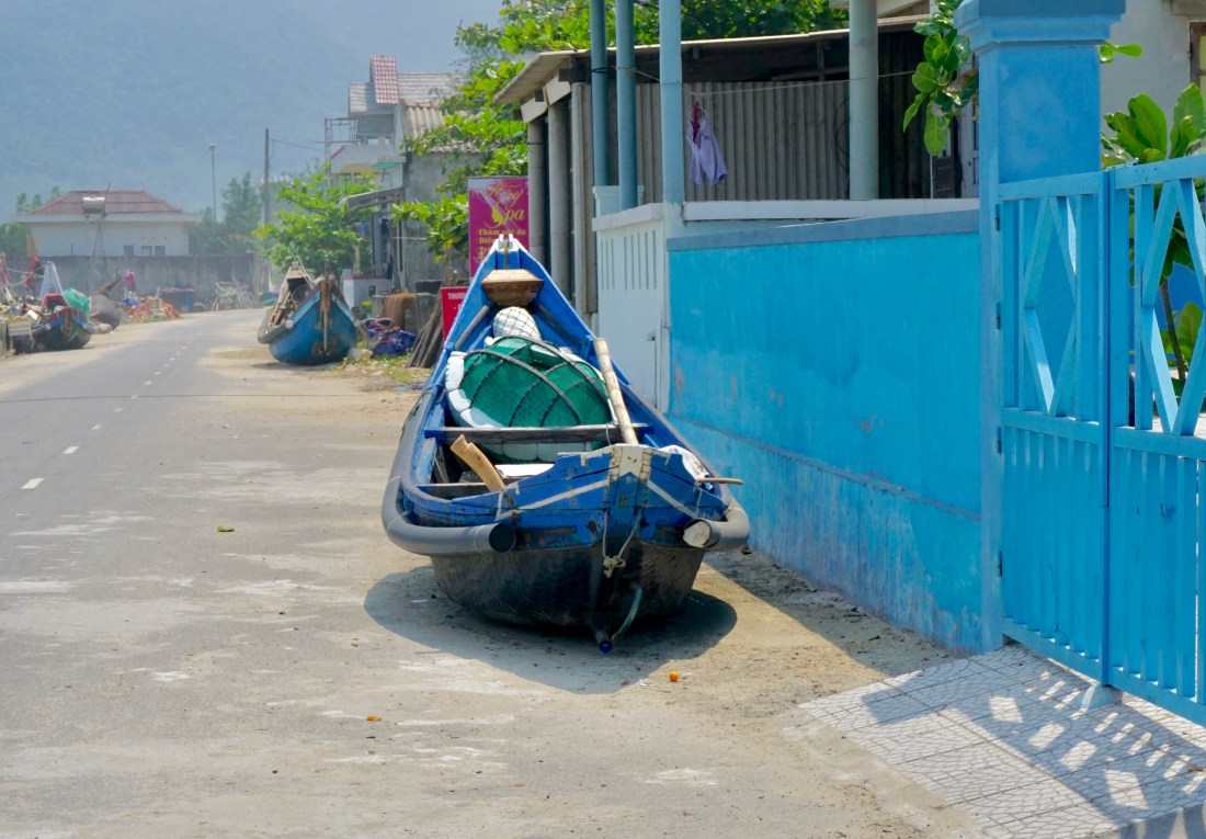 Our driver, Dong, takes us into his home village. Languid and deserted, boats are parked on the street with no one around. I walk onto the beach relishing the sand, checking the boats hiked up against a cement wall or marooned in brush. All are rigged with wrapped reed side pieces called sponsons that extend the hull and help with flotation and stability. I am loving the different kind of boats that are used in Southeast Asia and wondering if these belong to early morning or night fishing folk.