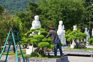 We descend toward the peninsula of Son Tra or Monkey Mountain to visit the Son Tra Linh Ung Pagoda that overlooks the East Sea. Originally a humble Buddhist shrine 200 years ago that protected the fisherman was recently redone and expanded into a park complete with ornate temples, exquisite bonsai plantings and a 67 meter tall Quan Yin statue. It is a serene place with beautiful views and a quiet getaway from the city.