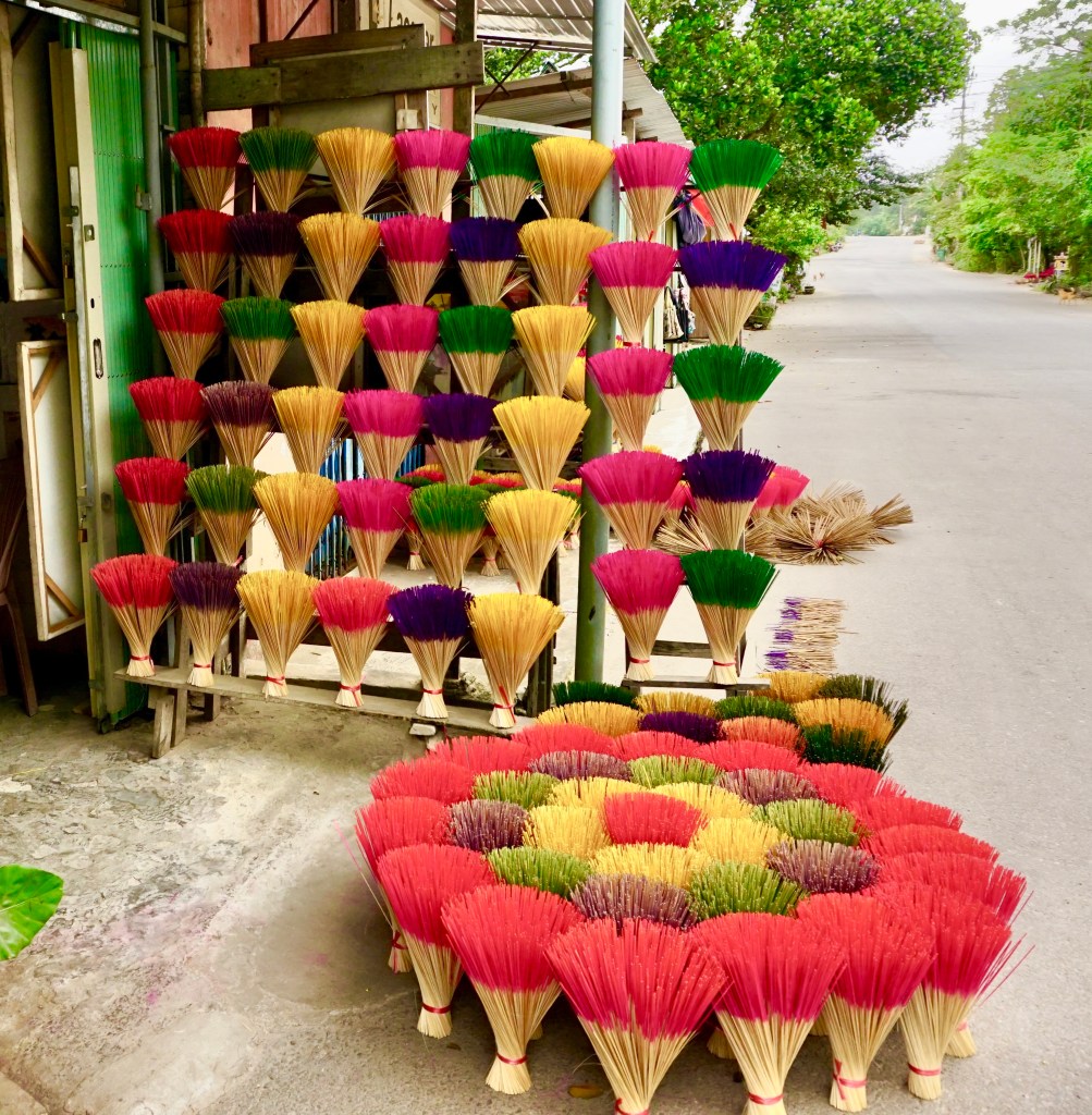 Incense – a little wood powder, glue, sandalwood or cinnamon rolled into sticksI am starting to get cranky and tired of sightseeing. It happens. Our pace has been a good mix of taking it all in and letting things unfold. Today my stomach is shaky, I want to be out of the city and be in nature, away from tourists and slow it down. I have loved cycling in Hue (even though a bit busy and crazy) and visiting the Imperial City, achingly beautiful and full of history. Today is also our last day before we travel to Hoi An. We have heard the Emperors’ tombs are amazing and not to be missed. I make the decision to go and as it happens sometimes, I received all that I wanted.