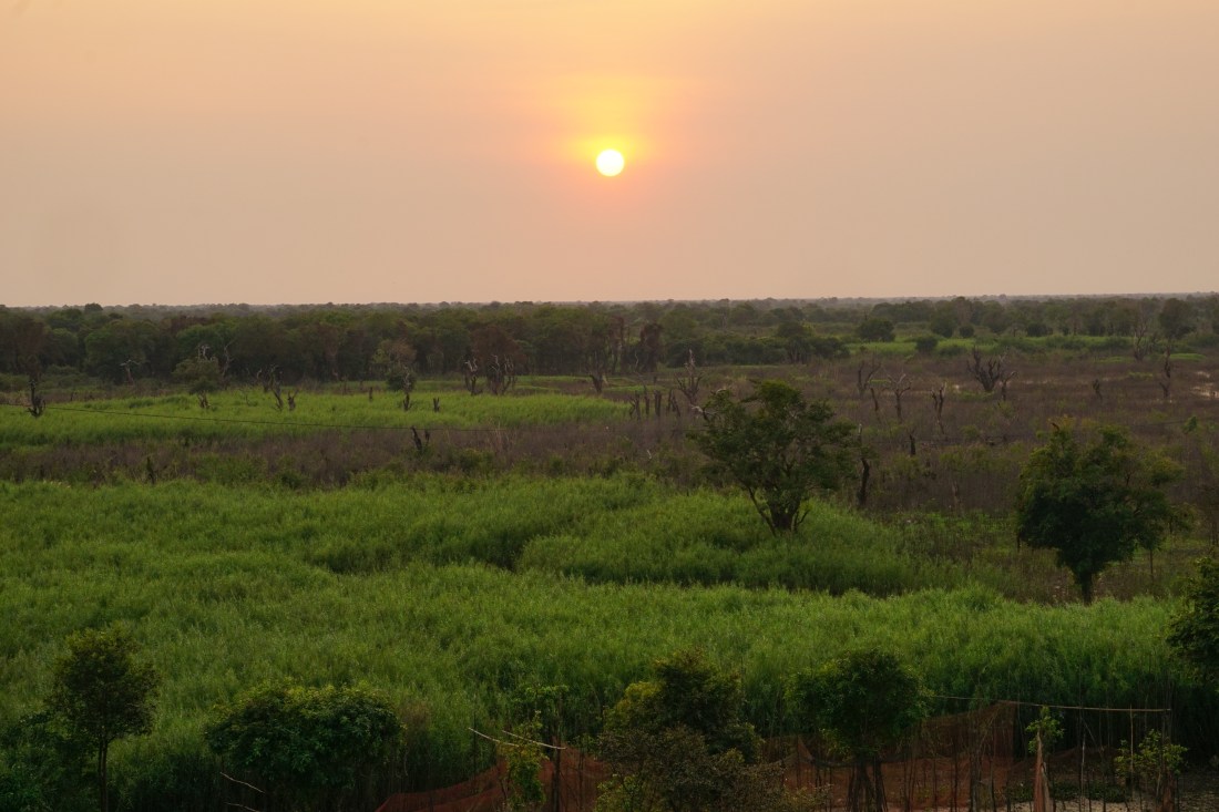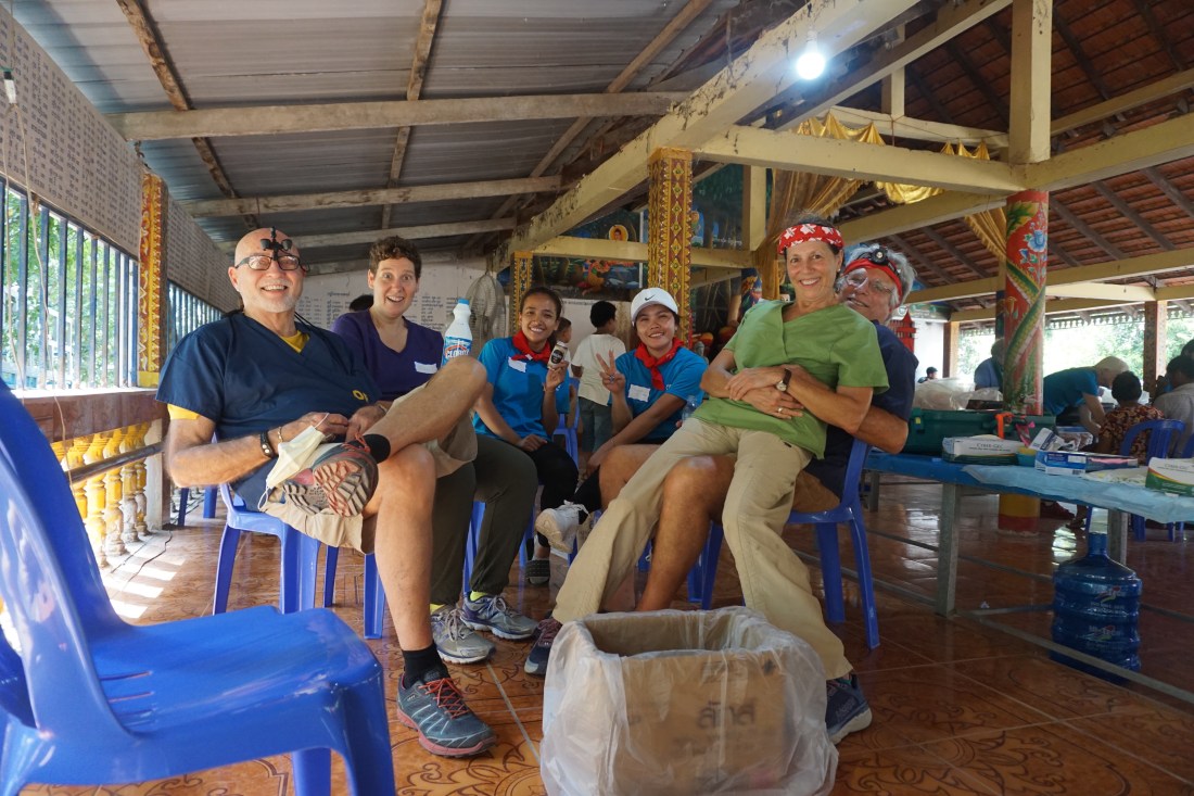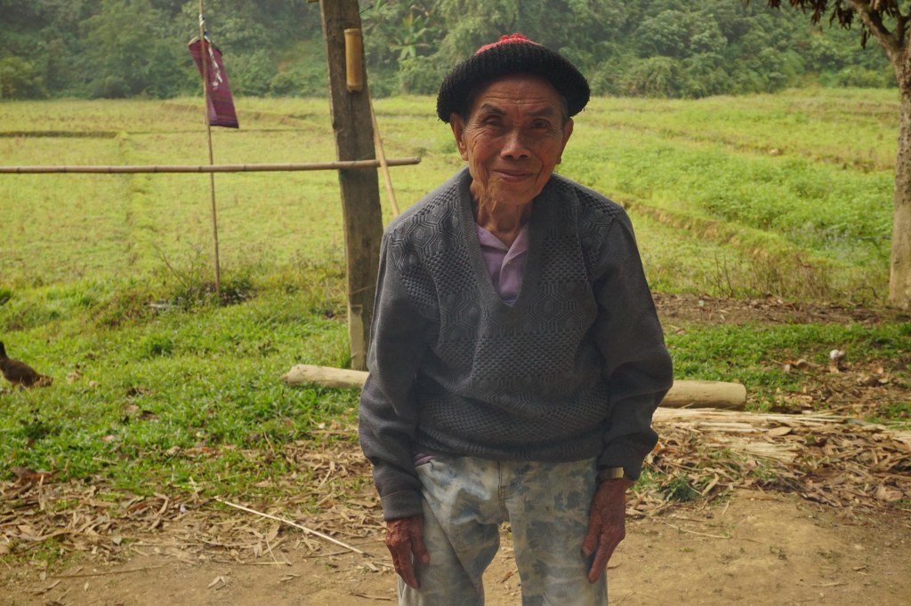 We take off our sandals, greet the farmer, drop our packs and stare in wonderment at what we’ve walked into. It is a half wood, half bamboo hut perched on several acres of now dried rice paddies. There’s a smoky cooking fire in the corner. Outside everything is free range. We are happy with the barnyard concert of peeping, clucking, crowing, oinking, meowing and barking. The chirping is the best and noisiest. No English is spoken. I smile a lot, use gestures and point. We don’t quite know how to be of help; Pheang and Phe are helping set up dinner. The farmer who is 95, stooped but spry, heads out to the far reaches of his fields to gather greens.