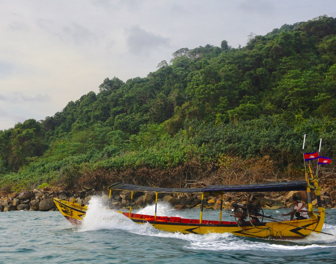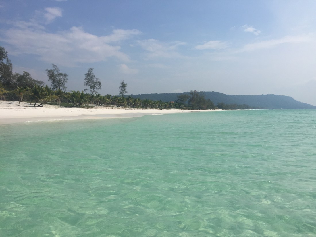 Long Beach, Koh Rong is 7 km of pristine white sand, coconut palms, some newly planted and others long lived, the clearest water with just enough turquoise coloring to remind you that it is ocean water. We are at Ryta Beach Resort, about 1+ years old and owned by Cambodians. What gives it Resort status? There is the beach, a few thatched canopies, hammocks, spotty WiFi and occasional electricity. No cabana services, or Mai Tai’s delivered to your hammock, no plastic kayaks, volleyball or Sports TV channel. There are only four of us on the beach right now and no one else in view anywhere. Gentle breezes and pleasant solitude on a gorgeous tropical day; it’s my kind of Resort .