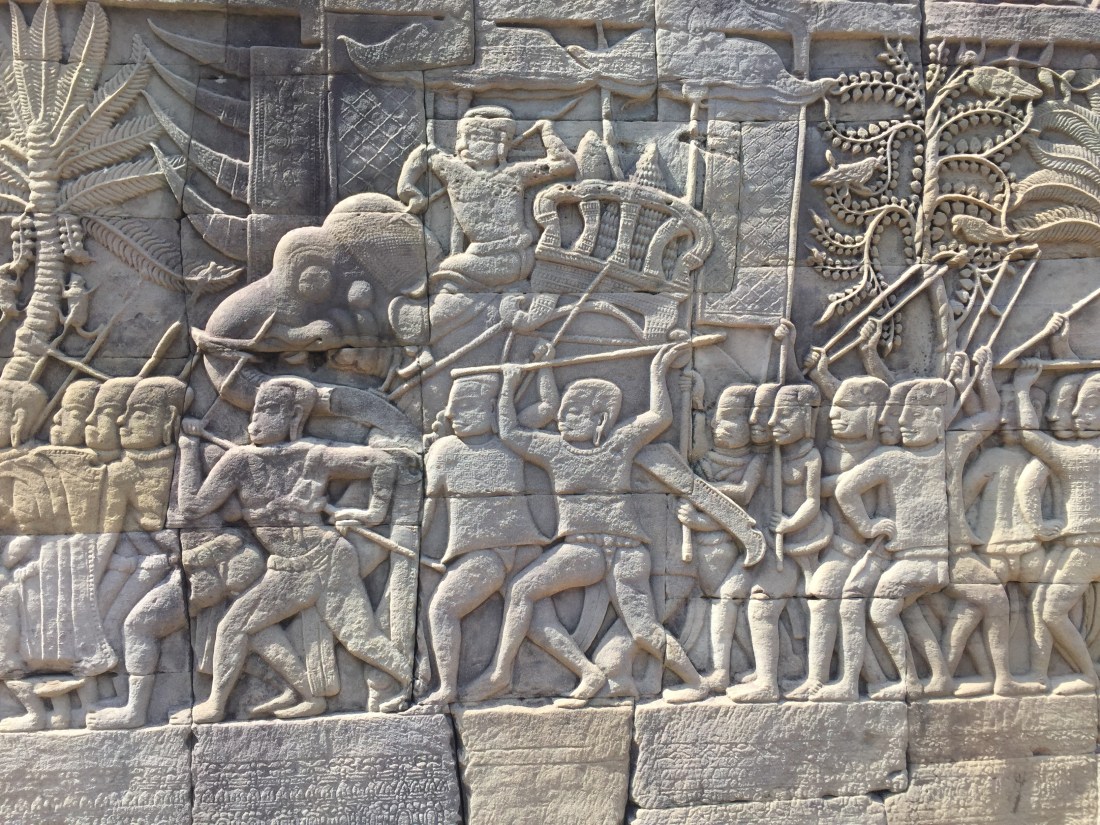 We trek the initial 6 miles. It is blistering hot. Steve has wrapped his krama around his head, “do rag” style, to keep sweat out of his eyes. I think he looks like Sinbad the sailor. Our guide Pheang and his girlfriend, Phe are wearing jackets, hats and gloves to keep from burning. I can’t believe I, too, am putting on my fleece jacket over a t-shirt. Just a few hours ago I was wearing it to ward off the cold on the river and now the jacket is the only protection I have from the sun. Pheang gives directions and distance, “jungle, sun, left, farm, jungle”. We long for jungle.