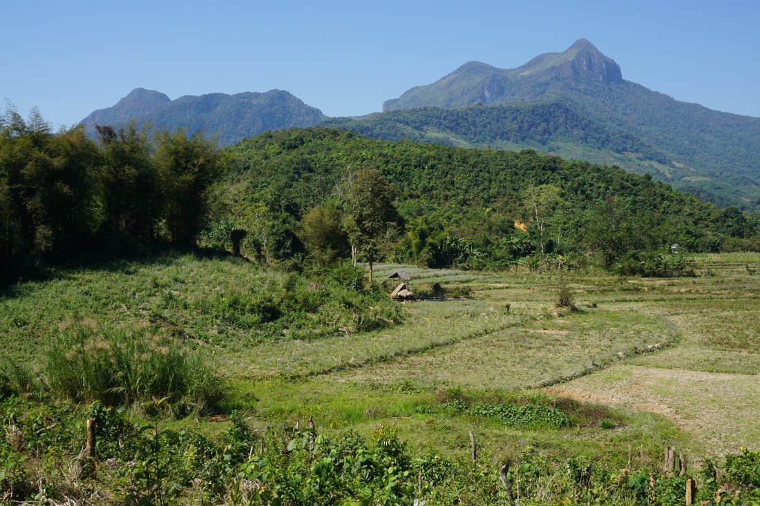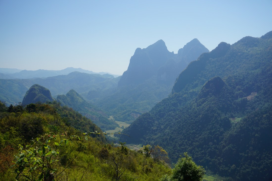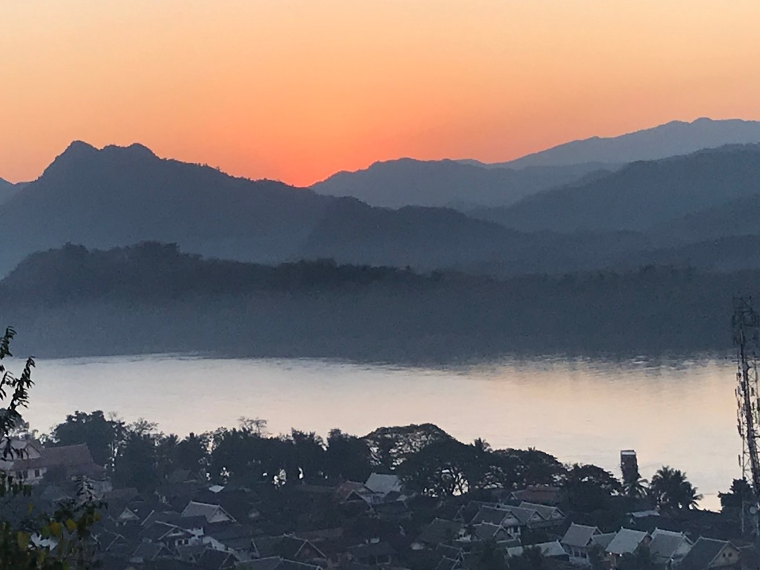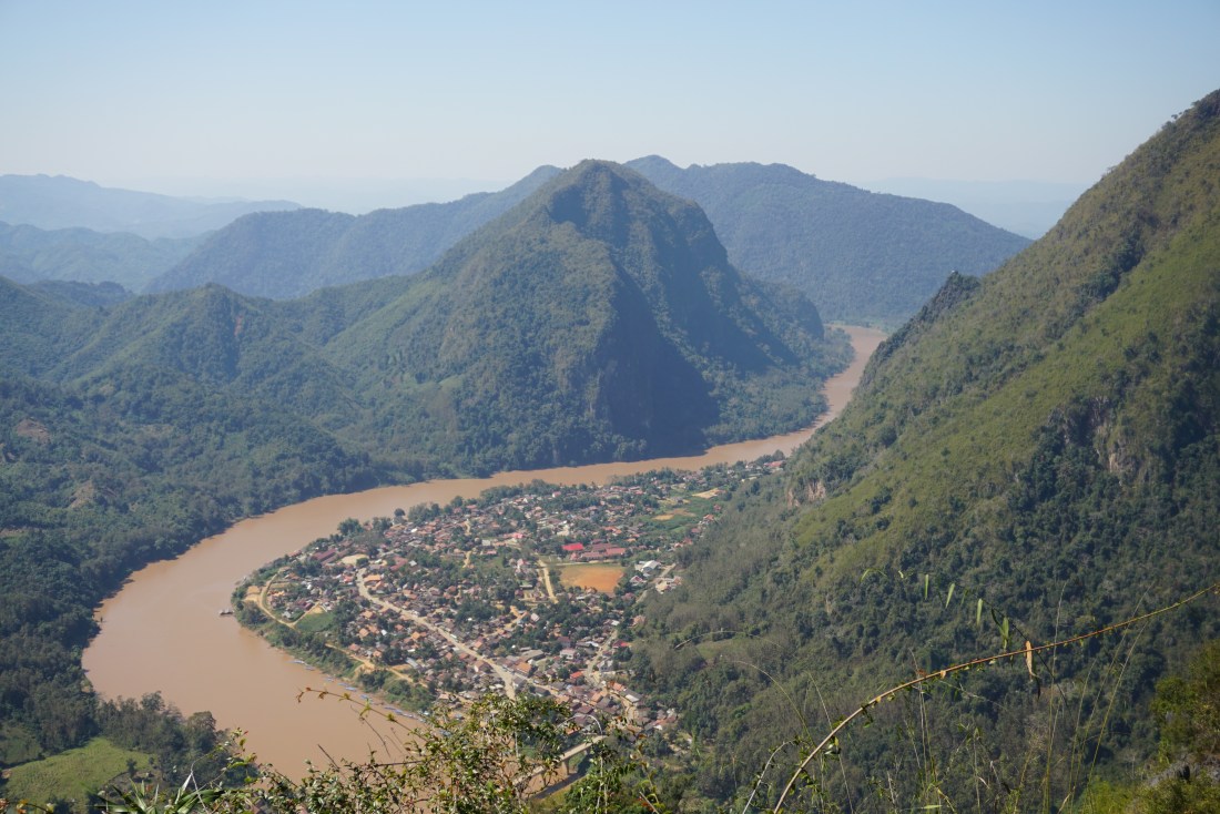We are staying on the river, a brown slit made narrow by slopes so steep that daylight is filtered out by the morning mist until 11 and the sun’s setting at 5:30. Nong Khiaw is a moderately small village, dirt roads, some Tuk Tuks, some motorbikes and a couple of cars.