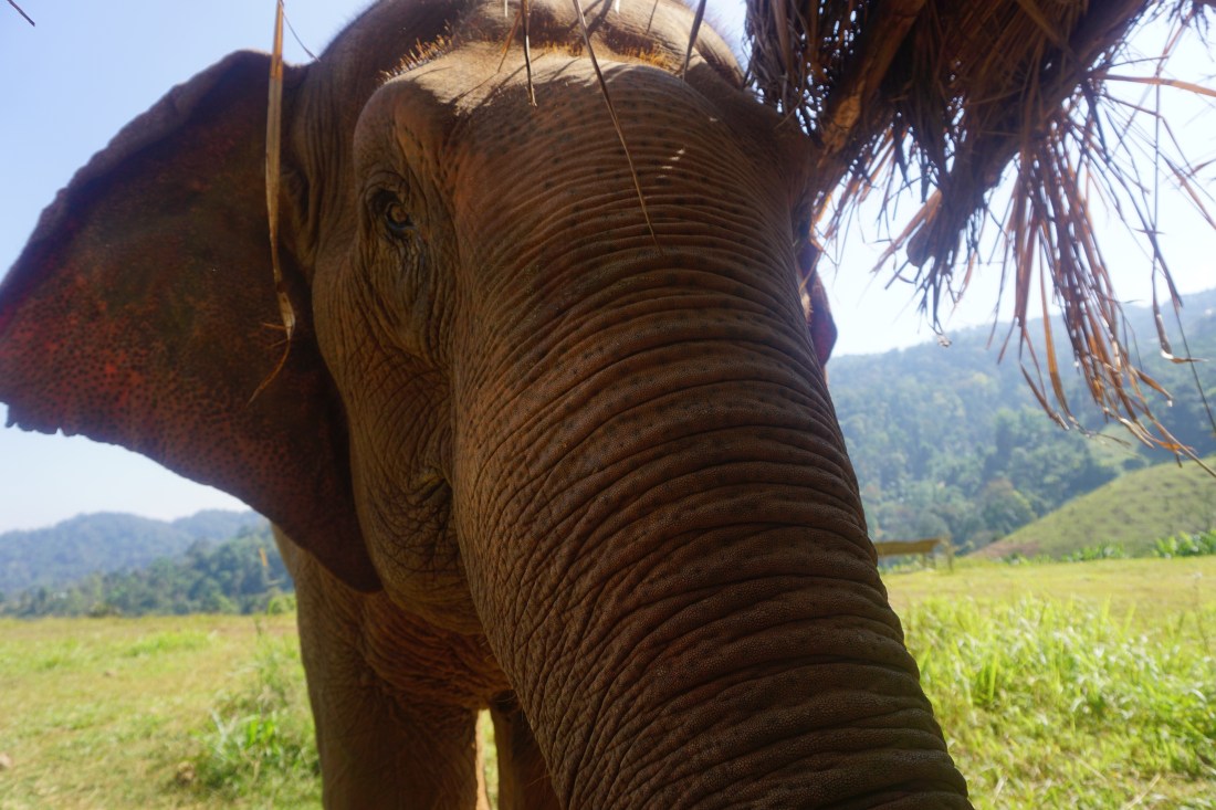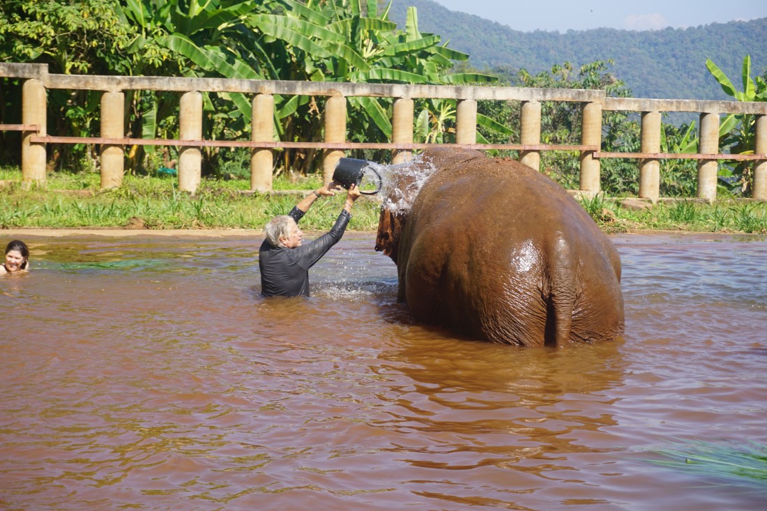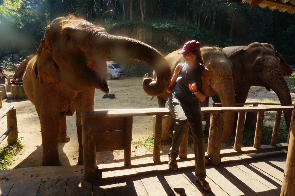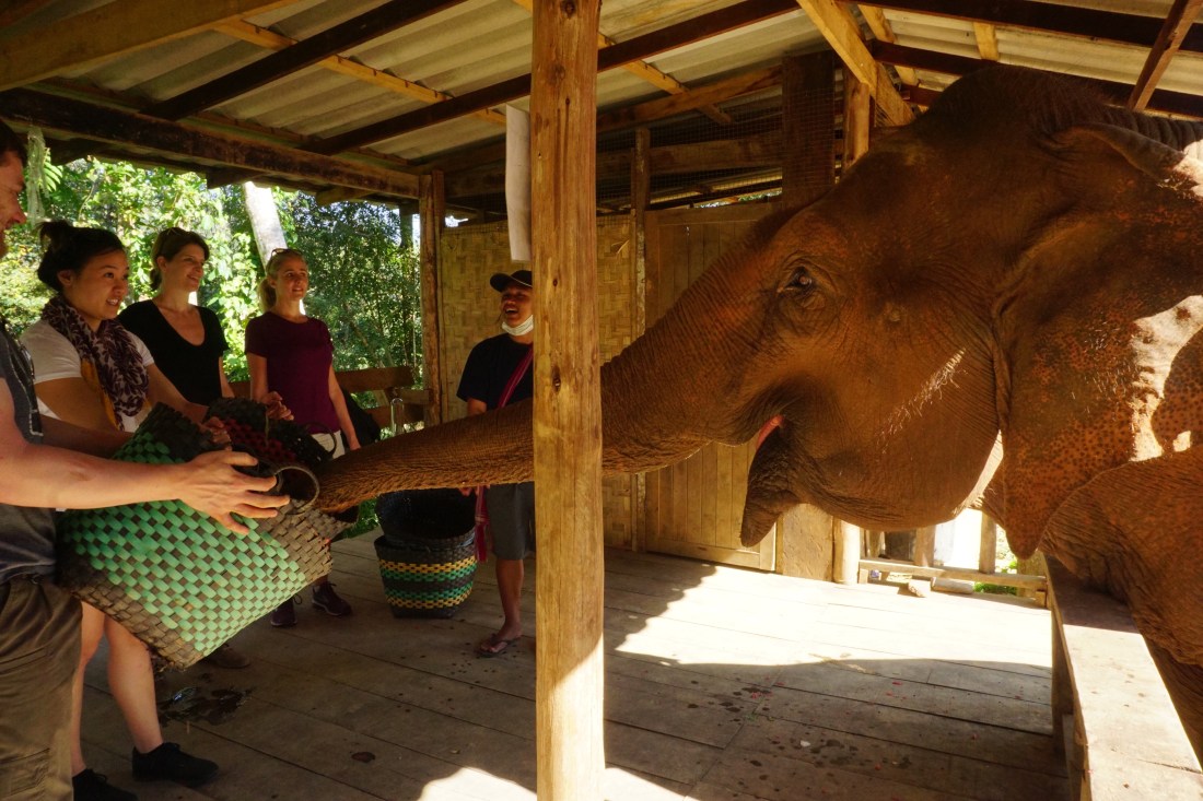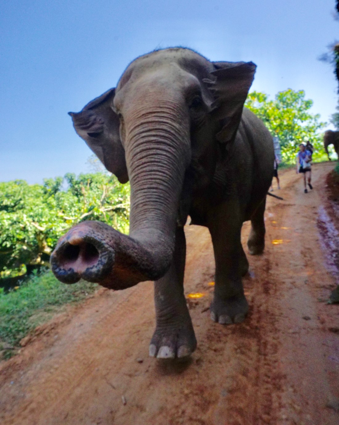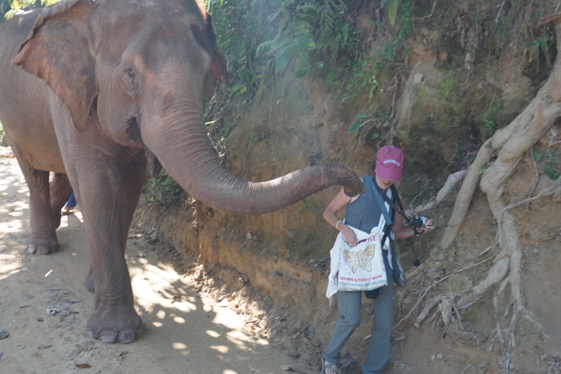 We are just hanging out, some of us covered in the sticky red mud, not really appreciating the cooling effect it has on the elephants. The elephants are just roaming, their mahouts lounging under a shelter. It is midday and hot. I and some others go for respite under a small pavilion. An elephant saunters over in front of me. I’m amused but then Steve says, “Turn around quick”, and there is another, very very close and moving forward! She wants to come in but her head keeps bumping the structure. We vacate the shelter as she begins to rock the the poles.