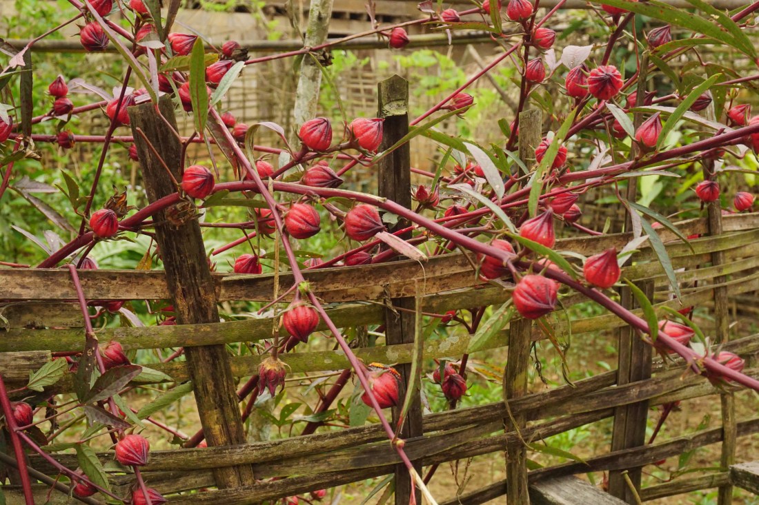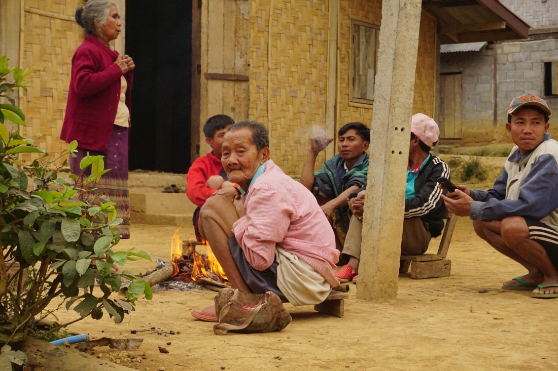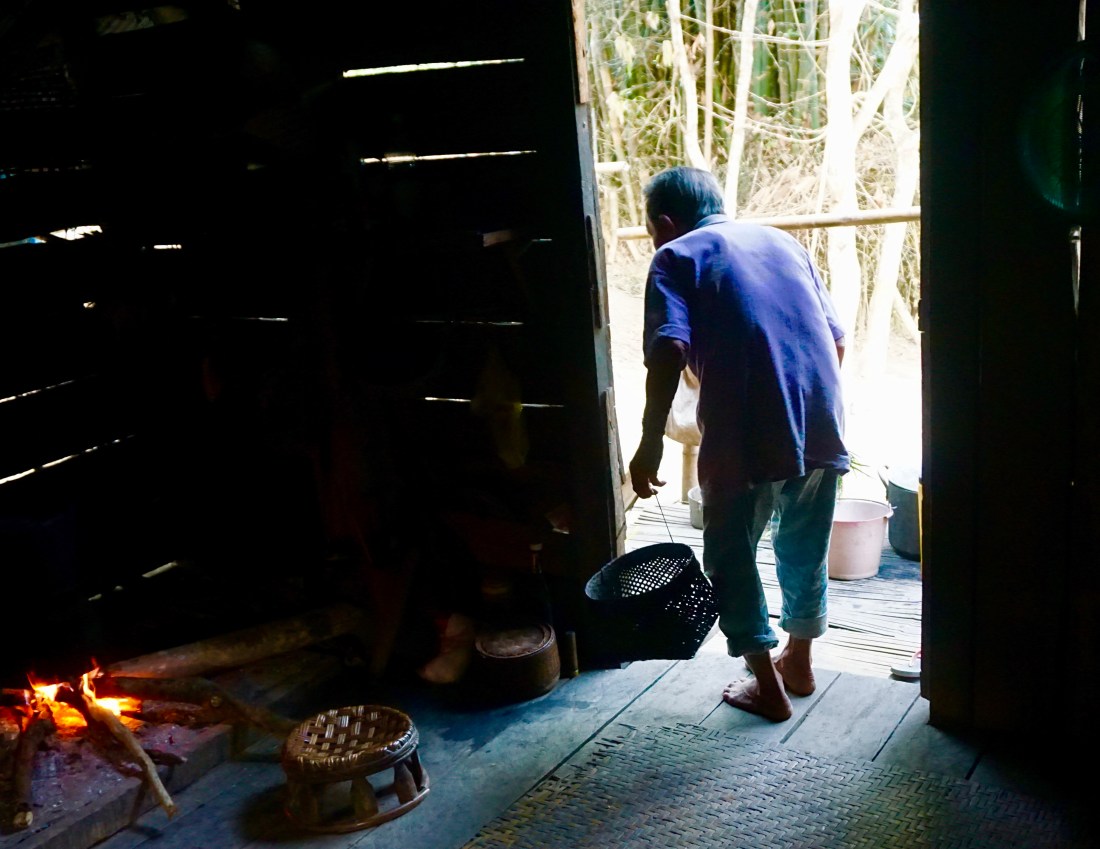 The wife heads to the river for water. We hang out with chicks and pigs. I’m delighted by the hand made baskets of all shapes and sizes for fishing, seating, collecting and carrying stuff: wood, spices, sticky rice. 40 kilo bags of dry rice from Thailand are stacked against one wall. We are treated to starfruit dipped in chili sauce and herbs. The temps keep dropping. We hang by the fire.