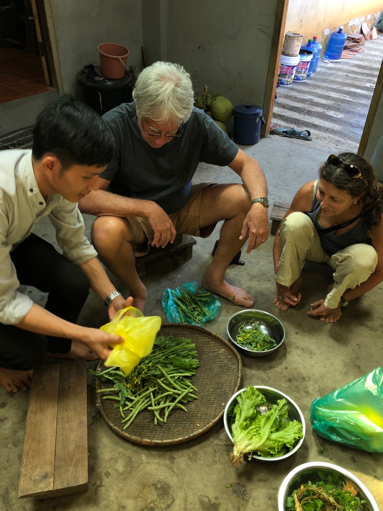 Our place is owned by a Mr. Mang and his wife, Chen. She manages the guests while Mr. Mang runs a tour company down the road. It is a simple lodging that suits us fine. The view is dramatic from the veranda. We catch up on laundry and emails and enjoy the sense of timelessness. People motor their “long boats” to deliver goods, or to fish or to transport family or tourists and it is a pleasure to simply watch. We wander past homes, simple bamboo and cement structures, cooking fires outside their doors, men weaving baskets, women tending children and talking to each other.